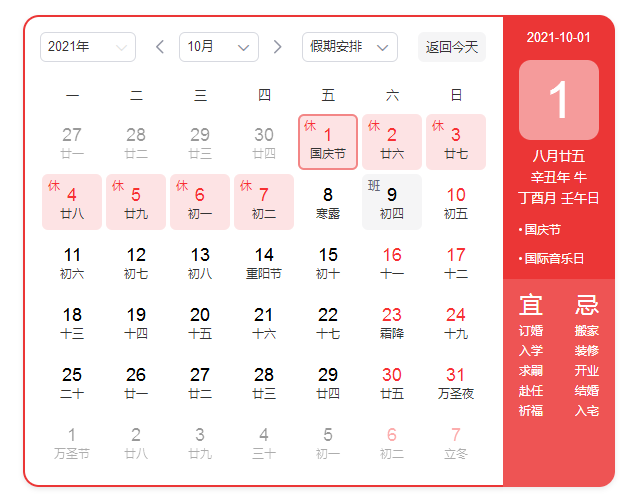 1、10月1日至7日放假調休,共7天。9月26日(星期日)、10月9日(星期六)上班。