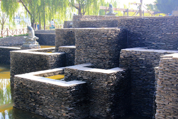 (6)水景的冬季處理。在寒冷的北方,設計時應該考慮冬季時水結冰以后的處理。在加拿大的某些廣場上,冬天就是利用冰來做公眾娛樂活動的。如果為了防止水管凍裂而將水放空,則必須考慮池底暴露以后是否會影響景觀效果,所以通常會對池底進行適當的裝飾,如用鵝卵石鋪砌成各種圖案等。