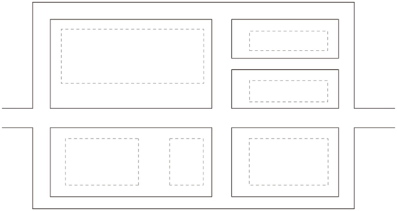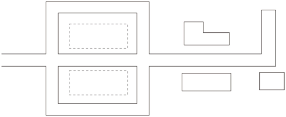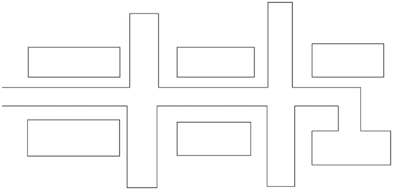 道路主要平行于主要建筑、構(gòu)筑物,圍繞各庫房進(jìn)行布置,這種道路布置形式受地形條件限制,一般不宜在山區(qū)丘陵地區(qū)采用,且道路的總長(zhǎng)度及占地較多,對(duì)于交通繁忙、車流和人流組織需要分離的采用,如圖所示。