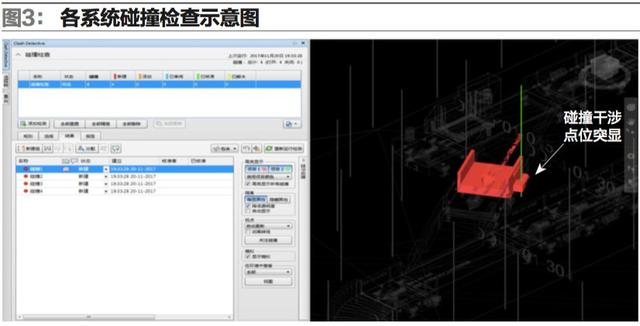 5.參照后的項目文件參照完成后可在項目中進行各系統模型的碰撞檢查(如圖3),預先檢查出各干涉點位,把問題解決在設計的初級階段,減少后期的返工和整改,從而保證項目設計質量,減少整個項目的運營成本。