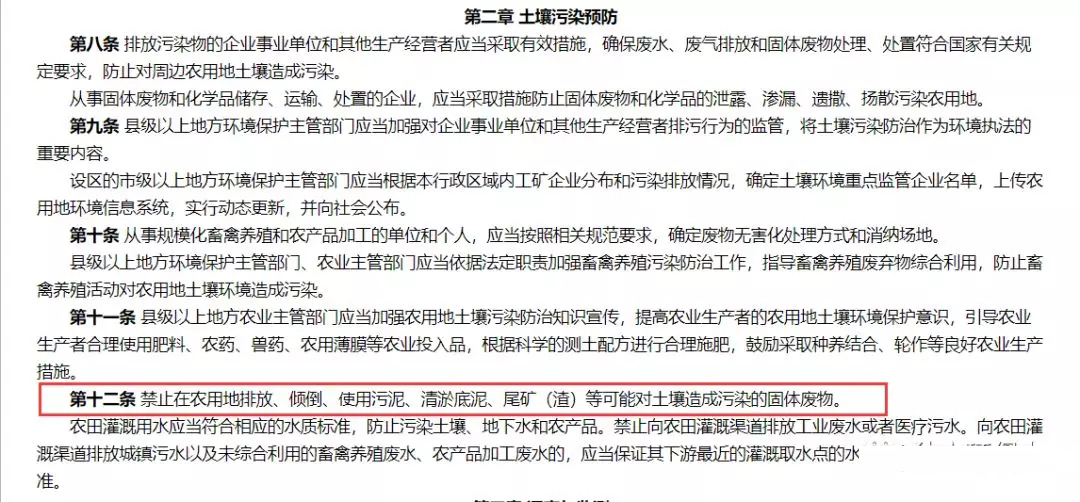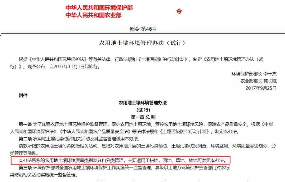 在該標(biāo)準發(fā)布之前,環(huán)保部和農(nóng)業(yè)部于2017年9月25日聯(lián)合發(fā)布了《農(nóng)用地土壤環(huán)境管理辦法(試行)》(環(huán)境保護部、農(nóng)業(yè)部令 第46號),自2017年11月1日起施行。該辦法第二條第三款規(guī)定:“本辦法所稱的農(nóng)用地土壤環(huán)境質(zhì)量類別劃分和分類管理,主要適用于耕地。園地、草地、林地可參照本辦法。”同時,該辦法第十二條第一款規(guī)定:“禁止在農(nóng)用地排放、傾倒、使用污泥、清淤底泥、尾礦(渣)等可能對土壤造成污染的固體廢物。"看到這里小伙伴們是不是有點蒙了,一個是強制性國家標(biāo)準,一個是部門規(guī)章,一個說只要滿足要求就可以用,另一個卻說禁止用。