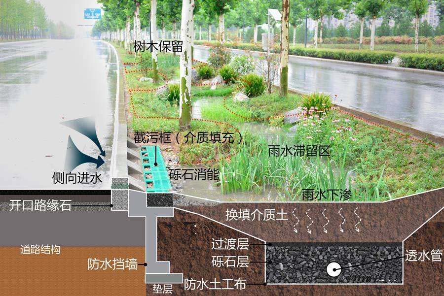 市政道路在城市各類基礎設施中所占的比例是很大的,但受到市政道路自身平面性和帶狀性的限制,“海綿城市”理念的運用主要體現(xiàn)在“滲、滯、凈、排”4個方面。例如,透水路面可以使雨水下滲,并通過結構層和基層的過濾實現(xiàn)水體凈化,從而完成對地下水的補充;下凹式綠地可以減慢徑流的流速,并通過雨水管網實現(xiàn)排放,降低市政雨水管網系統(tǒng)的壓力。