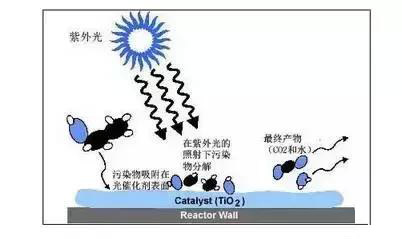 原理:光催化劑納米粒子在一定波長的光線照射下受激生產電子空穴對,空穴分解催化劑表面吸附的水產生氫氧自由基,電子使其周圍的氧還原成活性離子氧,從而具備極強的氧化還原能力,將光催化劑表面的各種污染物摧毀。