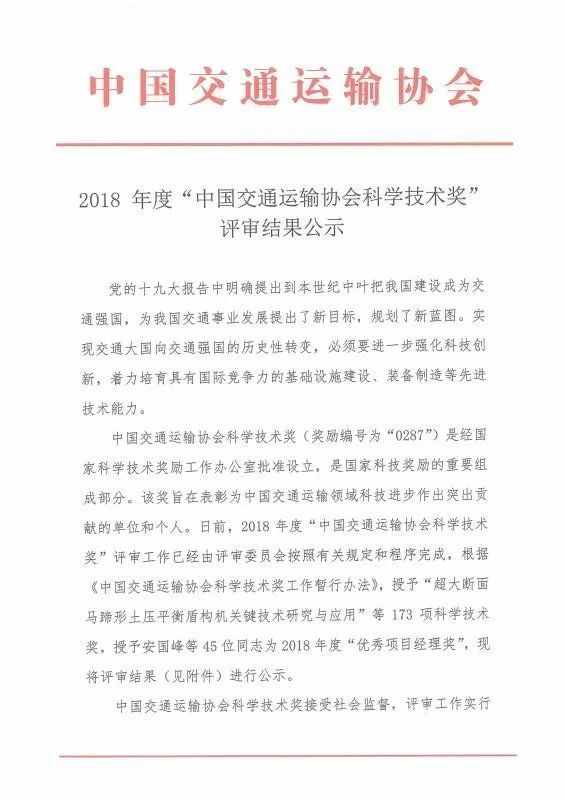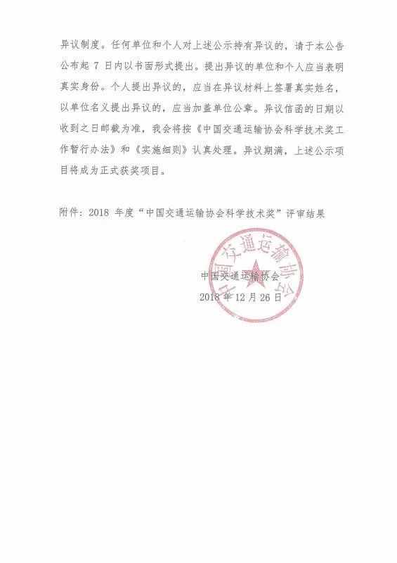 2018年度“中國(guó)交通運(yùn)輸協(xié)會(huì)科學(xué)技術(shù)獎(jiǎng)”評(píng)審結(jié)果公示
