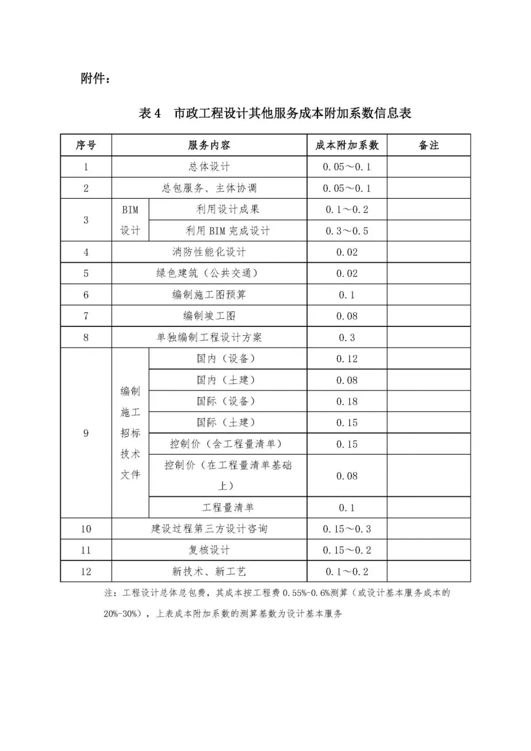 表4、市政工程設(shè)計(jì)其他服務(wù)成本附加系數(shù)信息表