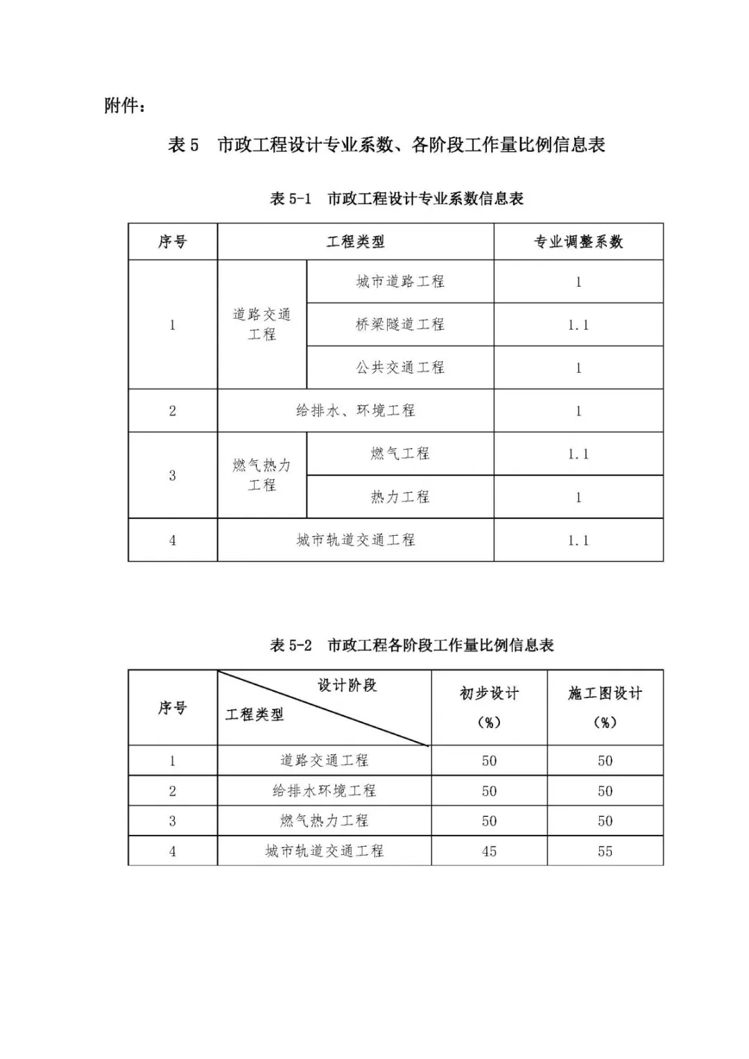 表5、市政工程設(shè)計(jì)專業(yè)系數(shù)、各階段工作量比例信息表