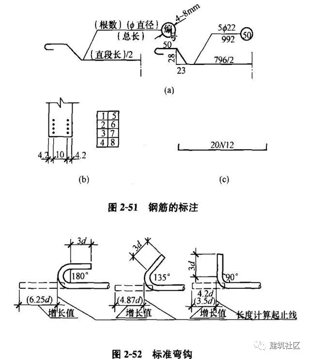 (5)鋼筋末端的標準彎鉤可分為90°, 135°, 180°三種(圖2-52)。當采用標準彎鉤時(標準彎鉤即最小彎鉤),鋼筋直段長的標注可直接注于鋼筋的側面(圖2-52)。