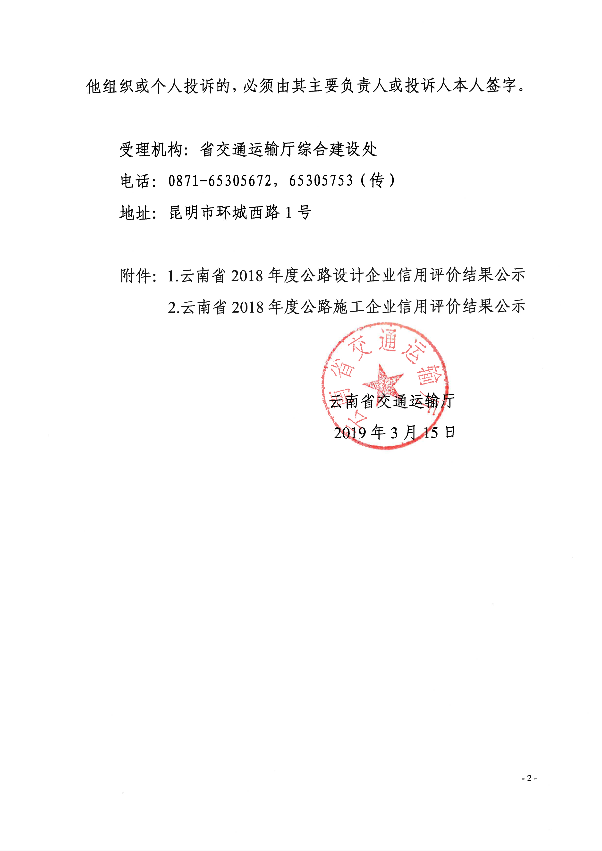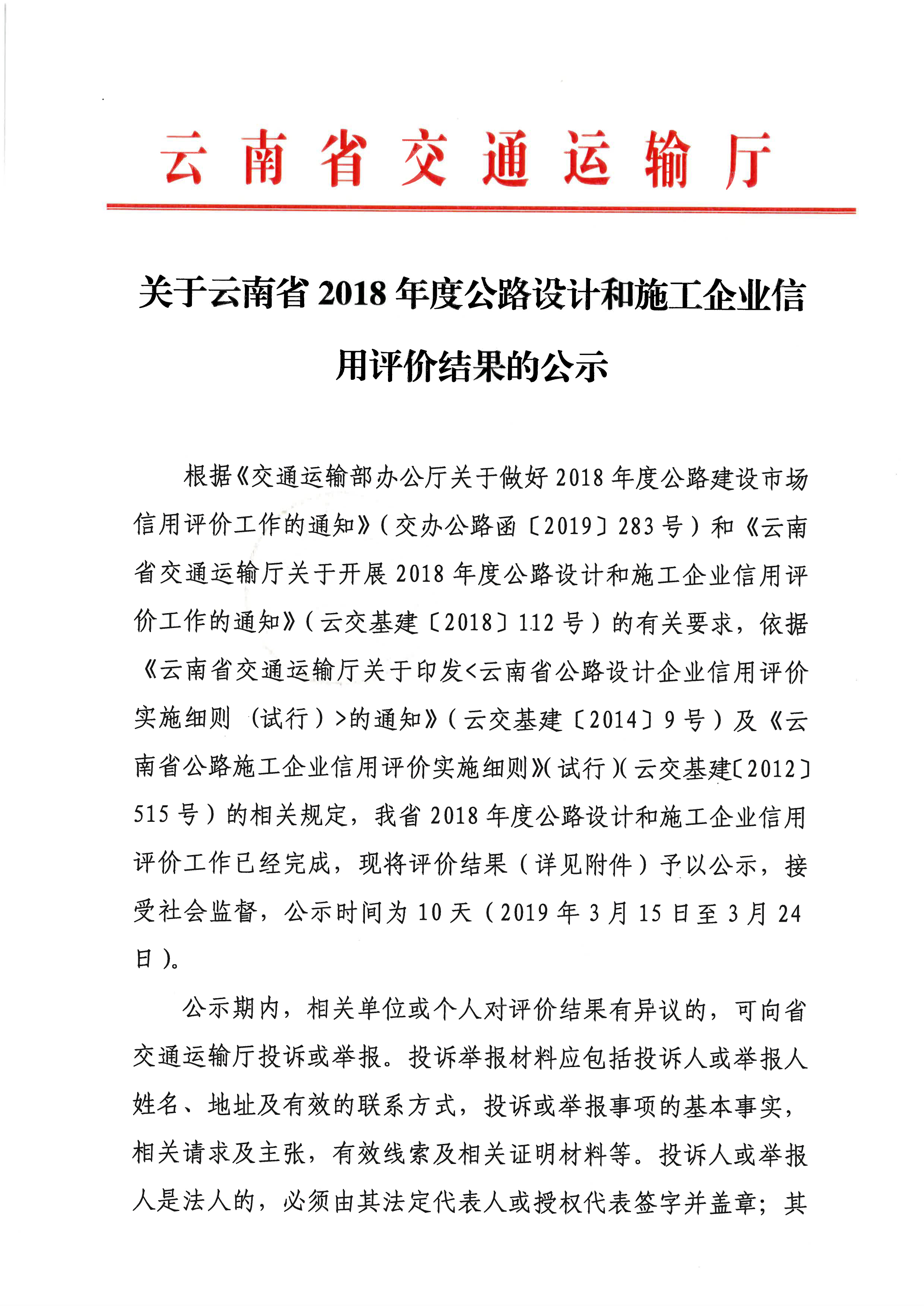 云南省2018年度公路設(shè)計(jì)和施工企業(yè)信用評(píng)價(jià)結(jié)果的公示