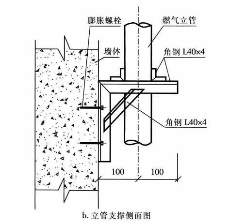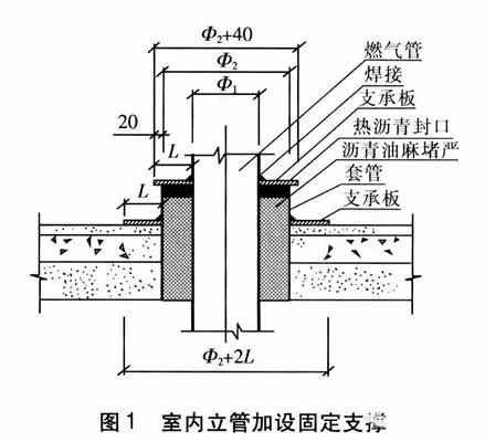 ① 對(duì)于室內(nèi)立管,在每隔7~10層的穿樓板處加設(shè)固定支撐,使燃?xì)夤艿?、套管以及建筑物成為一體。具體做法見(jiàn)圖1(圖中單位為mm)。