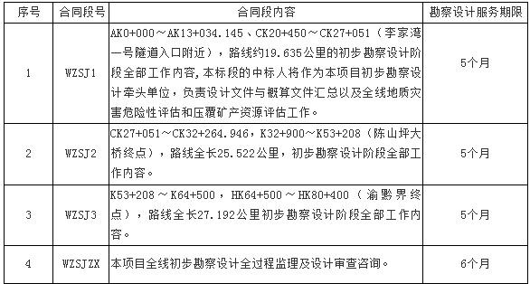 萬盛至正安高速公路重慶段啟動初步勘察設(shè)計,2019年6月4日發(fā)布了初步勘察設(shè)計及技術(shù)咨詢服務(wù)招標公告。據(jù)悉萬盛至正安高速公路重慶段劃分4個合同標段。估算總投資162.7億元,建安費約118.4億元。