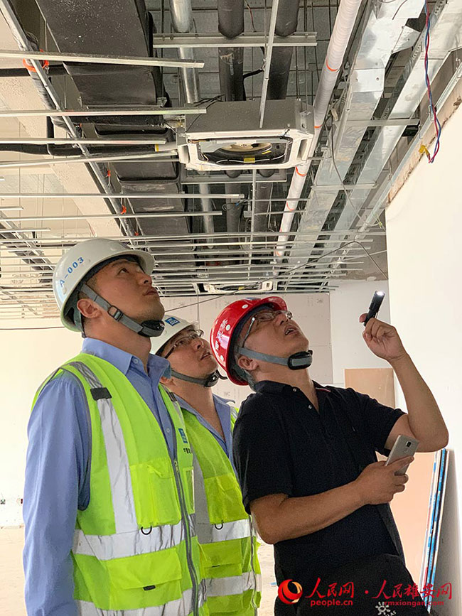 專家團隊在雄縣三中項目施工現場查看施工效果圖。張婭喃攝