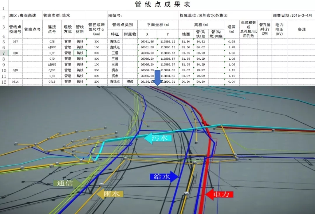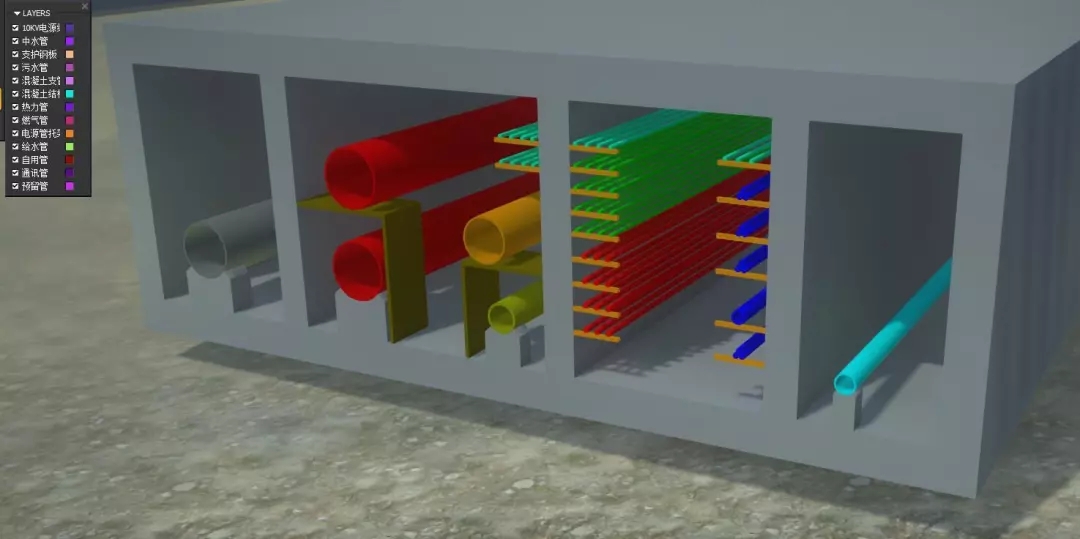 重建管網(wǎng)現(xiàn)狀模型。項目區(qū)域地下管網(wǎng)錯綜復雜,為探明復雜的管網(wǎng)現(xiàn)狀,避免設計延誤。項目組研發(fā)管網(wǎng)建模工具,重構了完整的地下管網(wǎng)BIM模型,準確定位,便于管廊設計與遷移。