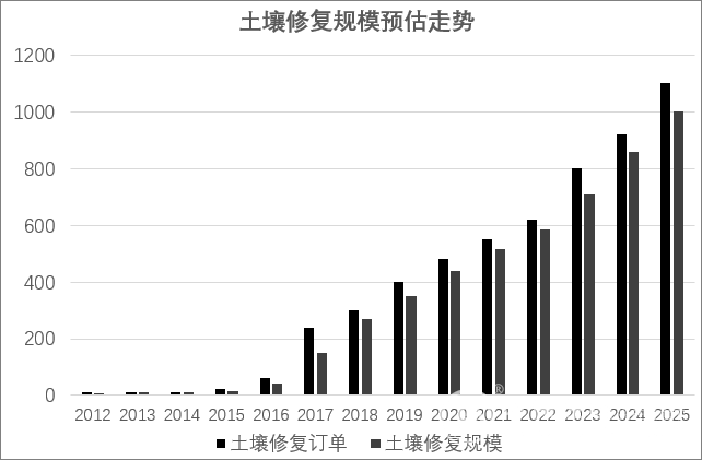 土壤修復(fù)規(guī)模預(yù)估走勢(單位:億元)。資料來源:公開數(shù)據(jù)整理