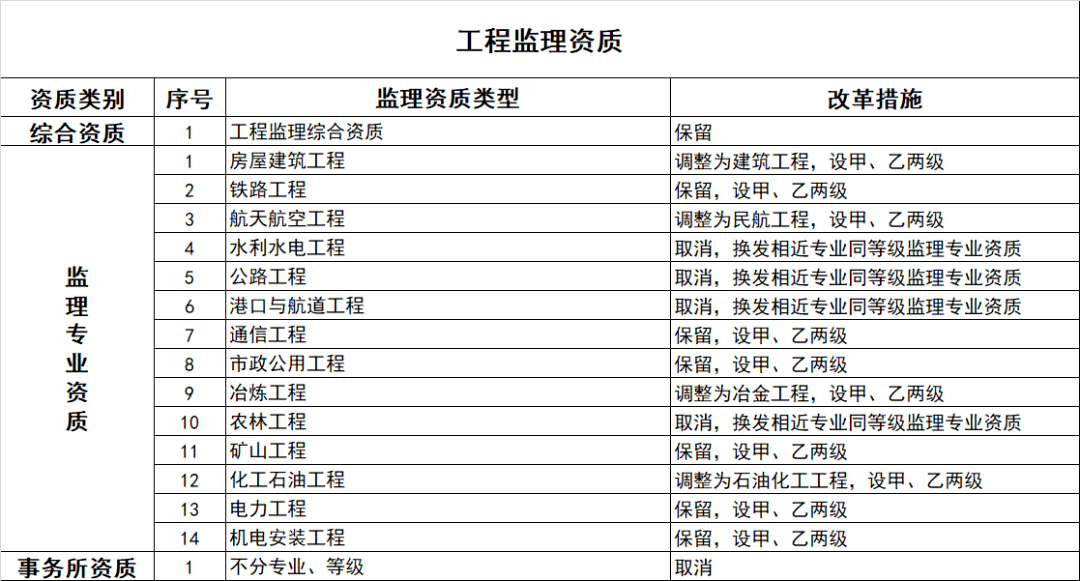監理專業資質等級壓減為甲、乙兩級,原丙級資質并入相應專業的乙級資質。取消事務所資質。