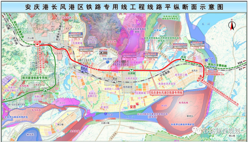 長風港區鐵路專用線主要承擔長風港區鐵水聯運以及臨港企業的運輸任務,是全國十二個鐵水聯運示范項目之一。項目位于安徽省安慶市懷寧縣、宜秀區、大觀區、迎江區境內,線路自合九鐵路安慶線新設月山鎮站引出,向東沿城市規劃預留鐵路廊道經宜秀區、大觀區、迎江區,終至長風港區,通過合九鐵路、安慶線與國鐵路網聯通。正線全長34.36公里,設月山鎮站、長風港站2座車站。建設工期2年。工程為新建國鐵Ⅳ級單線內燃鐵路專用線,設計時速80km/h,設車站2座,設橋梁4座/13.706km、隧道1座/3.855km,橋隧比約60.9%。