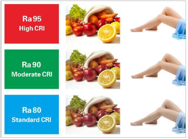 是指物體被光源發出的光照明時色彩被還原的真實程度。白熾燈的顯色指數為100,也就是說它對于色彩的還原性可以做到100%。現在市面上對于LED光源的應用越來越普及,住宅照明產品光源的顯色指數都應該要大于80,優質LED光源的顯色指數能達到90以上甚至95,但是有一大部分的劣質產品其光源的顯色指數都不到70,所以用戶在選擇的時候一定要引起注意。下面關于顯色指數的對比圖可以有一個相對直觀的感受: