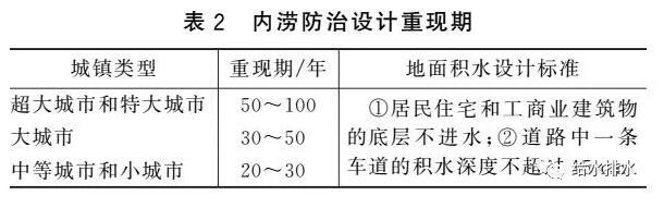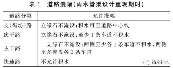 《Urban Storm Drainage Criteria Manual》對于內澇防治設計重現期時的道路積水有詳細規定,我國《室外排水設計規范》有類似規定,見表2。