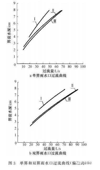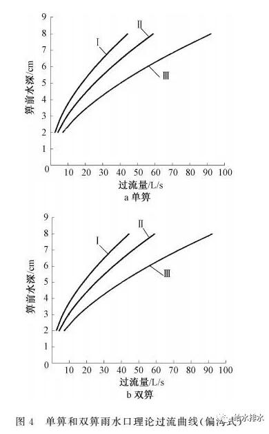 當箅前水深大于40 mm時,圖集還提供了雨水口過流曲線圖供設計人員查找,見圖3。圖中Ⅰ、Ⅱ、Ⅲ型分別為道路縱坡0.3%、1.0%和3.5%。對雨水口泄水能力進行理論計算(箅子尺寸為0.45 m×0.75 m,不考慮箅子堵塞),計算結果見表4、表5和圖4。