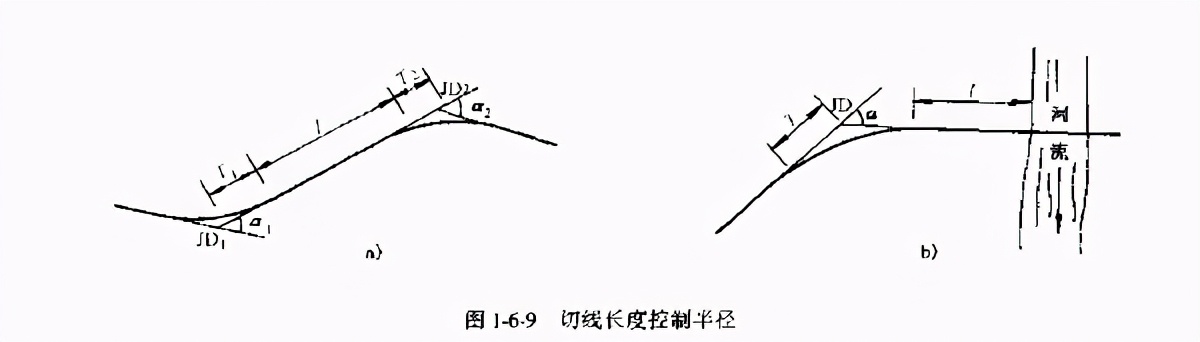 平曲線半徑的選定,除受地形、地物制約外,有時(shí)還應(yīng)考慮如何適應(yīng)前后線形的要求。如當(dāng)同向或反向曲線間直線長度較短時(shí),為解決曲線敷設(shè)與銜接,通常采用限制切線長度的方法來推求平曲線半徑,如圖1-6-9a)。橋梁或隧道兩端的曲線起、終點(diǎn)到橋頭或隧道口應(yīng)留有一定長度的直線段,如圖1-6-9b).此時(shí)平曲線半徑也應(yīng)根據(jù)切線來選定。