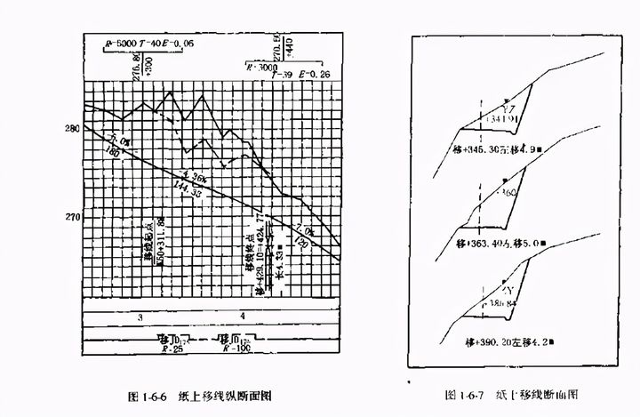 (6)按各樁在平面圖上的移距,在相應(yīng)各橫斷面圖上繪出移線后的中樁位置,并注明新樁號(hào)。