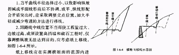 在公路定線過程中,往往由于定線時(shí)考慮不周、地形條件限制或其他原因,難免產(chǎn)生因平面中線位置不當(dāng)致使工程量過大、標(biāo)準(zhǔn)或線形不夠理想等缺點(diǎn)。此時(shí)可在分析研究已定路線平、縱、橫圖紙資料的基礎(chǔ)上,考慮移動(dòng)路線,使設(shè)計(jì)達(dá)到經(jīng)濟(jì)合理的要求,它對(duì)提高設(shè)計(jì)質(zhì)量,降低工程費(fèi)用起著一定的作用。當(dāng)路線設(shè)計(jì)出現(xiàn)以下情況時(shí),應(yīng)考慮紙上移線。