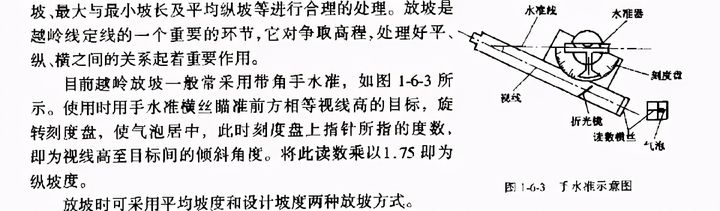 按平均坡度放坡:根據(jù)《公路工程技術(shù)標(biāo)準(zhǔn)》規(guī)定的平均坡度值5.0%—5.5%(按相對(duì)高差而定).視具體地形確定適當(dāng)?shù)目v坡度,然后實(shí)地放坡。按平均坡度放坡只起到在一定長度范圍內(nèi)控制高差和水平距離的作用,優(yōu)點(diǎn)是放坡速度快,但沒有反映公路等級(jí)對(duì)平均縱坡的不同要求以及地形、地質(zhì)變化的情況。