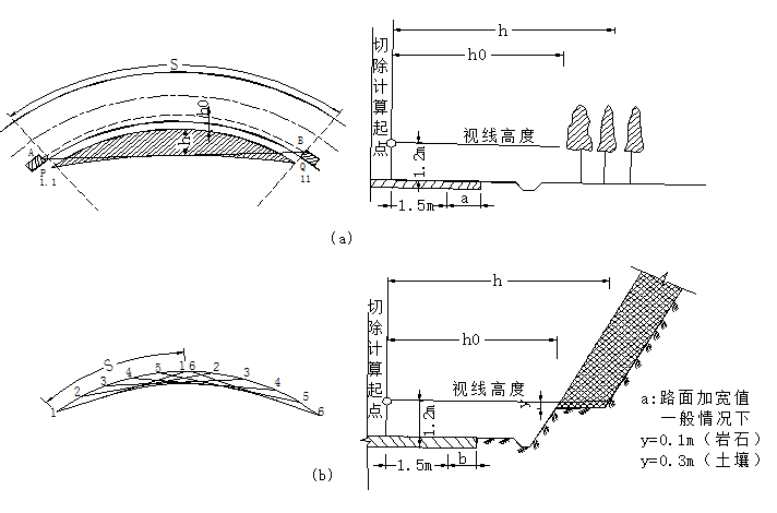 (1)道路平面上的暗彎,即處于挖方路段的彎道和內(nèi)側(cè)有障礙物的彎道,見圖a