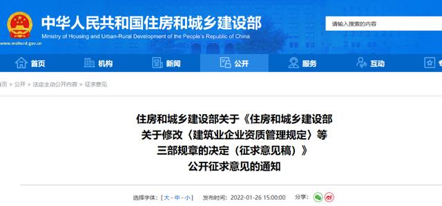 為落實(shí)建設(shè)工程企業(yè)資質(zhì)管理制度改革要求,住房和城鄉(xiāng)建設(shè)部擬修改《建筑業(yè)企業(yè)資質(zhì)管理規(guī)定》《工程監(jiān)理企業(yè)資質(zhì)管理規(guī)定》《建設(shè)工程勘察設(shè)計(jì)資質(zhì)管理規(guī)定》,起草了《住房和城鄉(xiāng)建設(shè)部關(guān)于修改〈建筑業(yè)企業(yè)資質(zhì)管理規(guī)定〉等三部規(guī)章的決定(征求意見稿)》,現(xiàn)向社會公開征求意見。公眾可通過以下途徑和方式提出反饋意見: