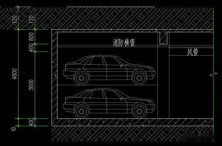 ●我國的車庫設計也必須根據所存車型來確定參數。一般中小型車(4.80 m×1.80 m×2.00 m)及貨車(7.00 m×2.50 m×2.60 m)可作為地下停車場的設計依據。