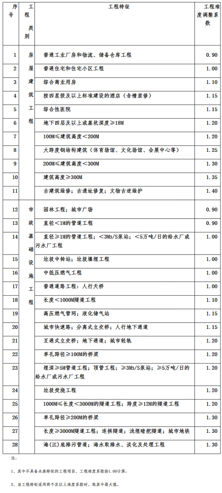 工程復雜程度分為一般、較復雜和復雜三個等級,其調整系數分別為:一般(Ⅰ級)0.85;較復雜(Ⅱ級)1.0;復雜(Ⅲ級)1.15。