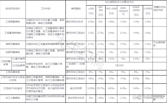 1.工程造價(jià)咨詢服務(wù)收費(fèi)根據(jù)不同咨詢項(xiàng)目的性質(zhì)、內(nèi)容采取差額定率分檔累進(jìn)方法計(jì)算;