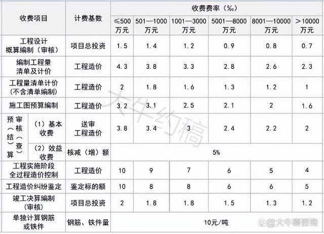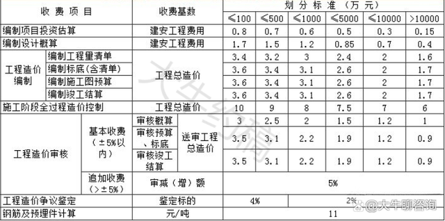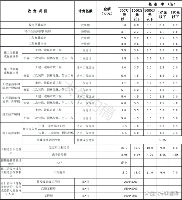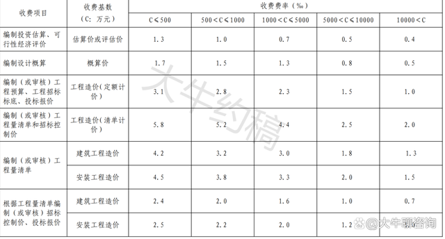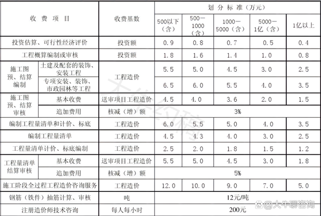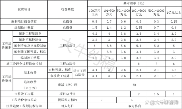 4.工程造價(jià)咨詢服務(wù)收費(fèi)按照本標(biāo)準(zhǔn)計(jì)算收費(fèi),低于每項(xiàng)3000元的按3000收取,超出3000元時(shí)按本標(biāo)準(zhǔn)收取;