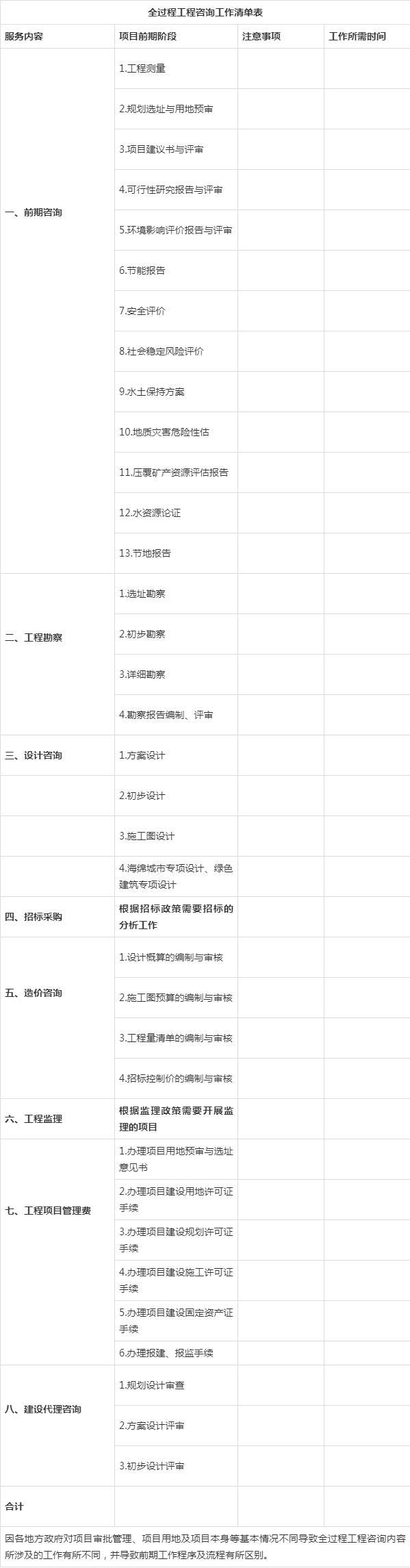 不難看出,以往的工程咨詢(xún)更多是關(guān)注項(xiàng)目建設(shè)準(zhǔn)備期(前期),而全過(guò)程工程咨詢(xún)還要求關(guān)注項(xiàng)目建設(shè)實(shí)施期及竣工期(后期),服務(wù)貫穿整個(gè)建設(shè)項(xiàng)目全生命周期(全過(guò)程)。