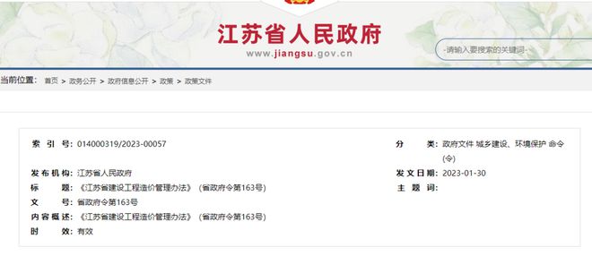 江蘇省人民政府令第 163 號《江蘇省建設工程造價管理辦法》已于2023年1月27日經(jīng)省人民政府第1次常務會議討論通過,現(xiàn)予公布,自2023年4月1日起施行。