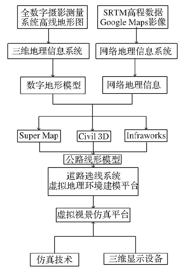 一方面,可通過SRTM高程數(shù)據(jù)、Google Maps影像等開放網(wǎng)絡(luò)地理信息資源的獲取與利用技術(shù)的研究;另一方面,利用全數(shù)字?jǐn)z影測量系統(tǒng),可通過航攝像片、衛(wèi)星遙感影像、傾斜攝影快速獲取數(shù)字地形模型、正射影像地圖及數(shù)字等高線地形圖等數(shù)字地形資料。然后將獲取的地理信息和地形數(shù)據(jù)通過Civil3D、SuperMap、Infraworks等軟件平臺建立公路線形模型,同時利用仿真技術(shù)和三維顯示設(shè)備進(jìn)行虛擬視景仿真體驗,并可對多種線路進(jìn)行方案比選和對比分析。