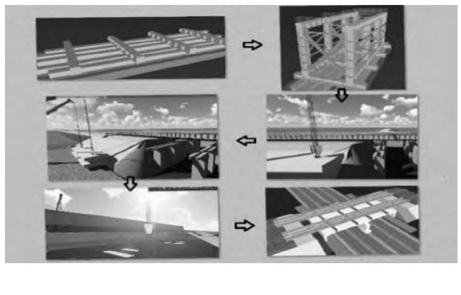 BIM技術(shù)與其他技術(shù)最大不同就是使用參數(shù)代替數(shù)據(jù)信息進(jìn)行建模。將公路工程中各種數(shù)據(jù)信息以參數(shù)的形式表示,對不同參數(shù)進(jìn)行分析,實現(xiàn)公路工程三維、立體模型的建立,能夠準(zhǔn)確、清晰地將不同施工環(huán)節(jié)以不同參數(shù)的關(guān)系表現(xiàn)出來[4]。通過建立施工現(xiàn)場及設(shè)備布置模型,一比一模擬道路實際施工場地,自動定義施工設(shè)施的4D屬性。點取任意設(shè)施實體,可查詢其名稱、類型、型號以及計劃設(shè)置時間等施工屬性,并可進(jìn)行場地設(shè)施的信息統(tǒng)計等,將場地布置與施工進(jìn)度對應(yīng),形成4D動態(tài)的現(xiàn)場管理[5]。通過建立三維施工現(xiàn)場模型,布置設(shè)備放置位置、控制進(jìn)場時間、綜合管理料區(qū)、模擬吊裝過程,讓各區(qū)段參與方直觀了解工作進(jìn)度和施工流程,對機(jī)械配置、勞動力配置、安裝時間進(jìn)行調(diào)控,將一定程度上解決因施工現(xiàn)場布置不當(dāng)造成的施工質(zhì)量和工期延誤問題,施工現(xiàn)場模擬見圖2。