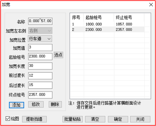 緯地軟件實現任意復雜線形設計3、批量設計錯車道和斷面寬度變化針對低等級公路需要添加的錯車道數量較多或者設置護欄時土路肩需要加寬的情況,緯地軟件增加了快速加寬設計功能。可根據加寬需求設置加寬名稱、加寬位置(含行車道、硬路肩、土路肩)、加寬值、加寬起終點樁號、加寬長度、過渡段長度等參數,也可直接提取該項目的擋墻設置段落進行加寬設計。