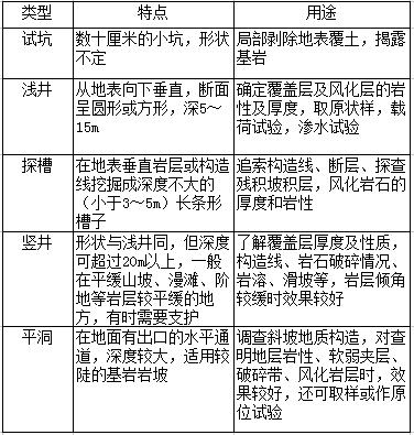 工程地質勘探中坑、槽、洞的類型 表1-1