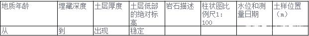 鉆孔地質柱狀圖是表示該鉆孔所穿過的地層而綜合成圖表表示。圖中表示有地質年代、土層埋藏深度、土層厚度、土層底部的絕對標高、巖土的描述、柱狀圖、地面絕對標高、地下水水位和測量日期、巖土怎樣選取位置等。柱狀圖的比例尺一般為1:100—1:500。