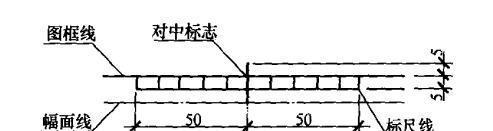 (2)需要縮微后存檔或復制的圖紙,圖框四邊均應(yīng)具有位于圖幅長邊,短邊重點的對中標志(圖2-1),并應(yīng)在下圖框線的外側(cè),繪制一段長100cmm標尺,其分隔為10mm。對中標志的線寬宜采用大于或等于0.5mm,標尺線的線寬宜采用0.25mm的實線繪制(圖2-2)