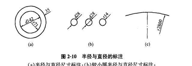 (8)半徑與直徑可按圖2-10(a)標注。當圓的直徑較小時,半徑與直徑可按圖2-10(b)標注;當圓的直徑較大時,半徑尺寸的起點可不從圓心開始,見圖2-10(c)0半徑和直徑的尺寸數(shù)字前,應(yīng)標注“r(R)”或“d(D)",見圖2-10(b).