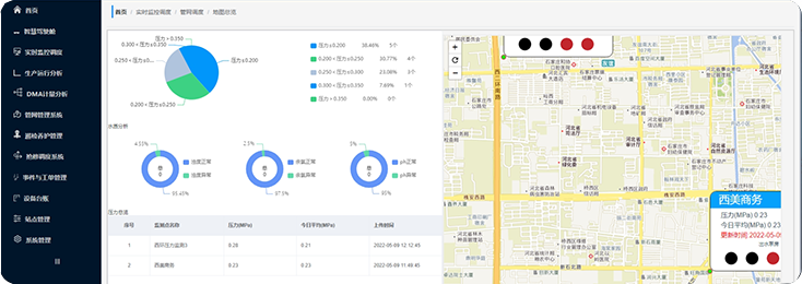 分組分層展示、分類展示、報警展示、圖層控制、管點管線查詢、管線管點與設(shè)備查詢、管線管點與設(shè)備統(tǒng)計